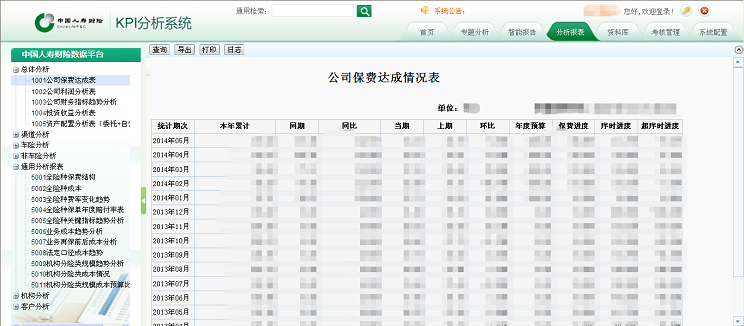 提供總體分析,渠道分析,車險分析,非車險分析,通用分析,機構分析,客戶分析等數據分析服務。對保費、利潤、成本、預算、收益等指標進行匯總統計。通過BI數據服務平臺完成以上統計分析報表的設計與制作,并將這些報表集成到中國人壽財險的業務平臺,在中國人壽財險業務平臺統一展現。