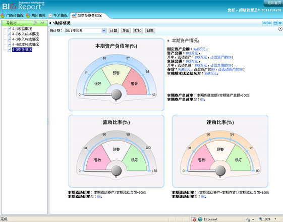 對于平均住院日及病床使用率等關鍵指標,我們通過儀表盤的方式進行展現(xiàn),通過與目標值的比較得出關鍵指標是否達標,并通過儀表盤上指針的指向能夠快速獲得關鍵指標的達標信息。