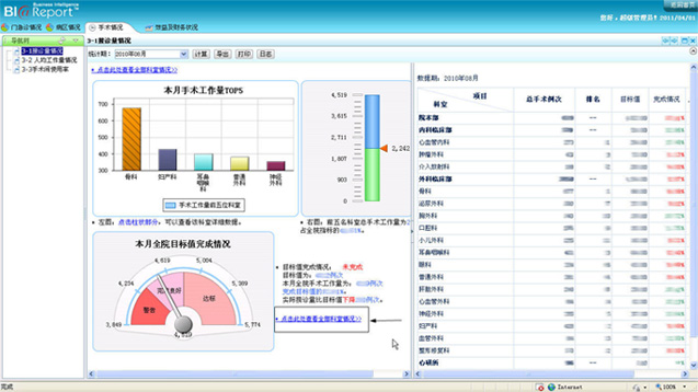 對于手工工作量我們通過按照科室進行排名,并將全院手術目標完成情況通過儀表盤的方式進行展現(xiàn),通過指針指向能夠快速了解手術指標完成情況。