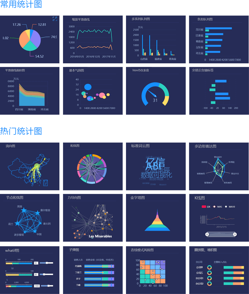 ABI采用JS、FLASH、HTML5三種技術(shù)自主開發(fā)統(tǒng)計(jì)圖,豐富的統(tǒng)計(jì)圖保證了其具有美觀的圖形展現(xiàn)能力,除了常用的柱狀圖、線狀圖、條形圖、面積圖、餅圖、點(diǎn)圖、儀表盤、走勢圖外,還支持和弦圖、圈餅圖、金字塔、漏斗圖、K線圖、關(guān)系圖、網(wǎng)絡(luò)圖、玫瑰圖、帕累托圖、數(shù)學(xué)公式圖、預(yù)測曲線圖、正態(tài)分布圖、迷你圖等,樣式包括2D、3D、EXCEL、AUTUMN、FLASH等;通過組合設(shè)計(jì)可以搭配處上千種視覺效果。